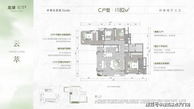 户型亮点:1T1户,四房三卫,L转角落地窗端厅,可享270度环幕采光。玄关左右动静分区,主卧套房与次卧套房隔开,提升了家庭成员间的隐私性。