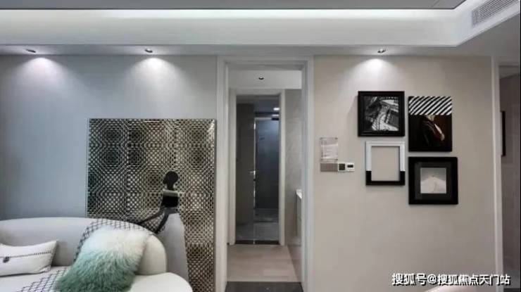 客厅和主卧都标配悬浮吊顶、无主灯设计,背景墙采用皮革和铝合金拼接,也都是实体交付的。