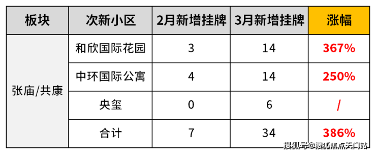 共康/庙行板块2月次新房的新增挂牌套数只有7套,3月直接暴涨至34套,整体涨幅约386%!