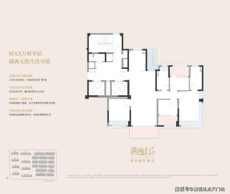建面约135㎡四房:四室均衡布局、多阳台设计、同样享有面积赠送。