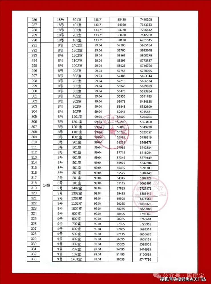 一房一价表如下