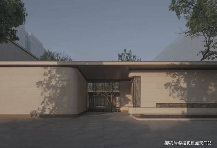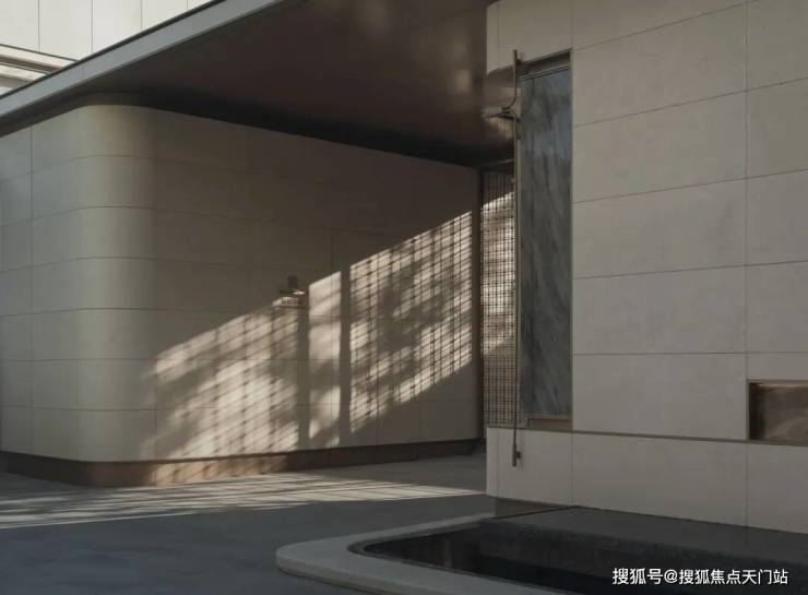 社区入口设计以“隐奢”为核心理念,摒弃传统豪宅项目的张扬符号,转而通过材质、比例与空间叙事的精准把控,传递低调中的精致感。主入口并未采用高耸的门楼或繁复的装饰,而是以米黄色石材与香槟金色金属格栅的组合,构建出克制而优雅的视觉语言。