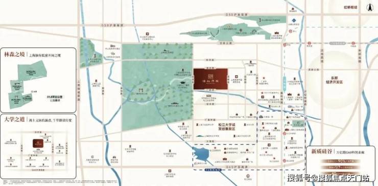 地块所在的广富林板块,本身的生态资源非常优秀,项目西侧一路之隔就是广富林文化遗址、广富林郊野公园、直线距离约1km+是辰山植物园,北面直线距离约3km是佘山国家森林公园、月湖雕塑公园等。