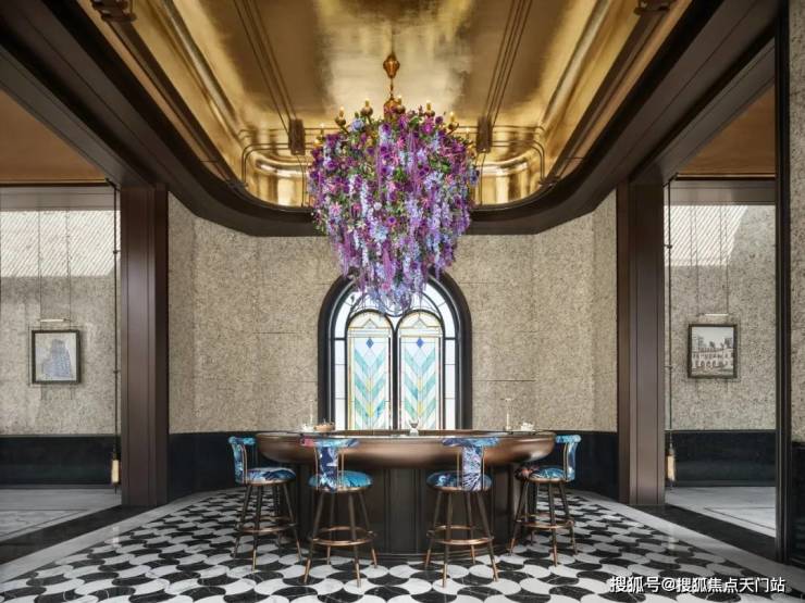 走进落客区,头顶美轮美奂的约300㎡彩色玻璃穹顶,灵感来自于和平饭店,融入老洋房PRADA荣宅的特殊徽章转译。其中水波纹玻璃、镶嵌玻利维亚蓝奢石带来了丰富的层次感,光影相间的繁复感,仿佛让人步入时光长廊,这样充满艺术性的归家礼仪,让人一眼着迷!