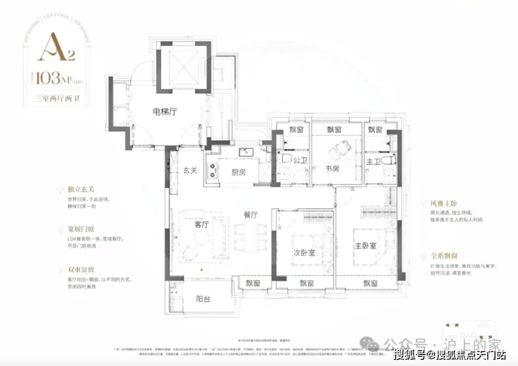 103㎡该户型同样是三开间+大横厅的布局,但主卧尺度更进一步,能够隔出一个大衣帽间和化妆间!全屋享有5个飘窗+南向观景阳台,连餐厅区域也自带南向飘窗,大大提升居住舒适度!