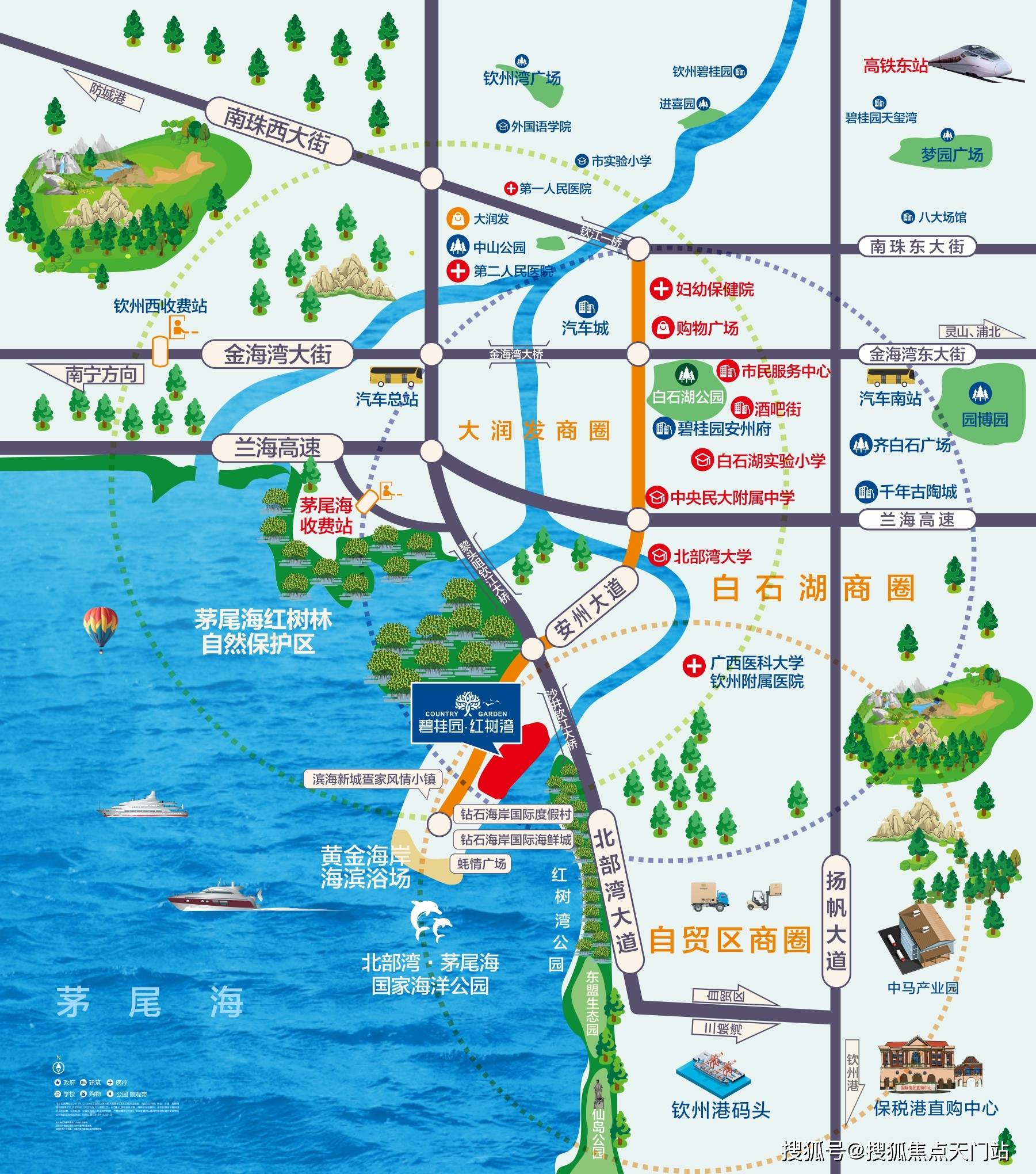 便捷交通:多维立体交通路网 通达八方:处于整个北部湾经济圈的核心位置,是北部湾城市群的交通枢纽,三大机场环绕从项目出发30-45分钟可达南宁、北海、防城港,2小时能通达广西北部湾经济区六市,3-4小时可达广州等珠三角城市,5-6小时可达贵阳、成都、重庆、香港等城市,交通非常便利。