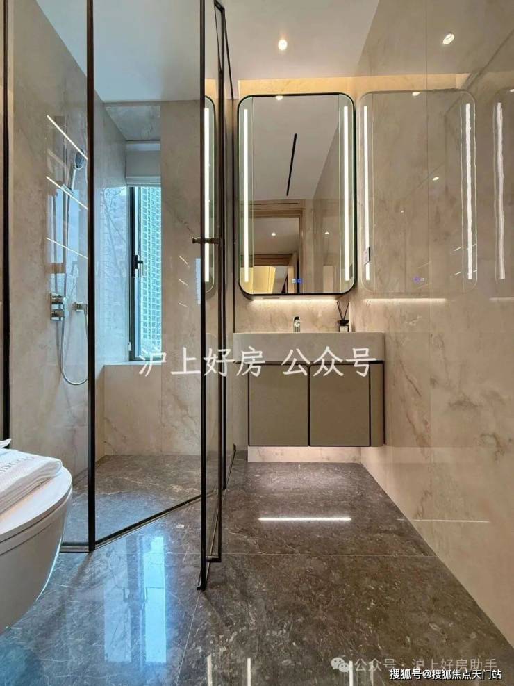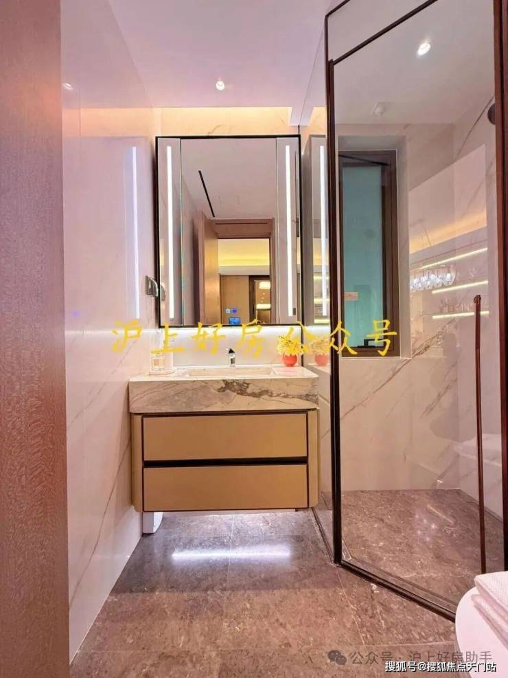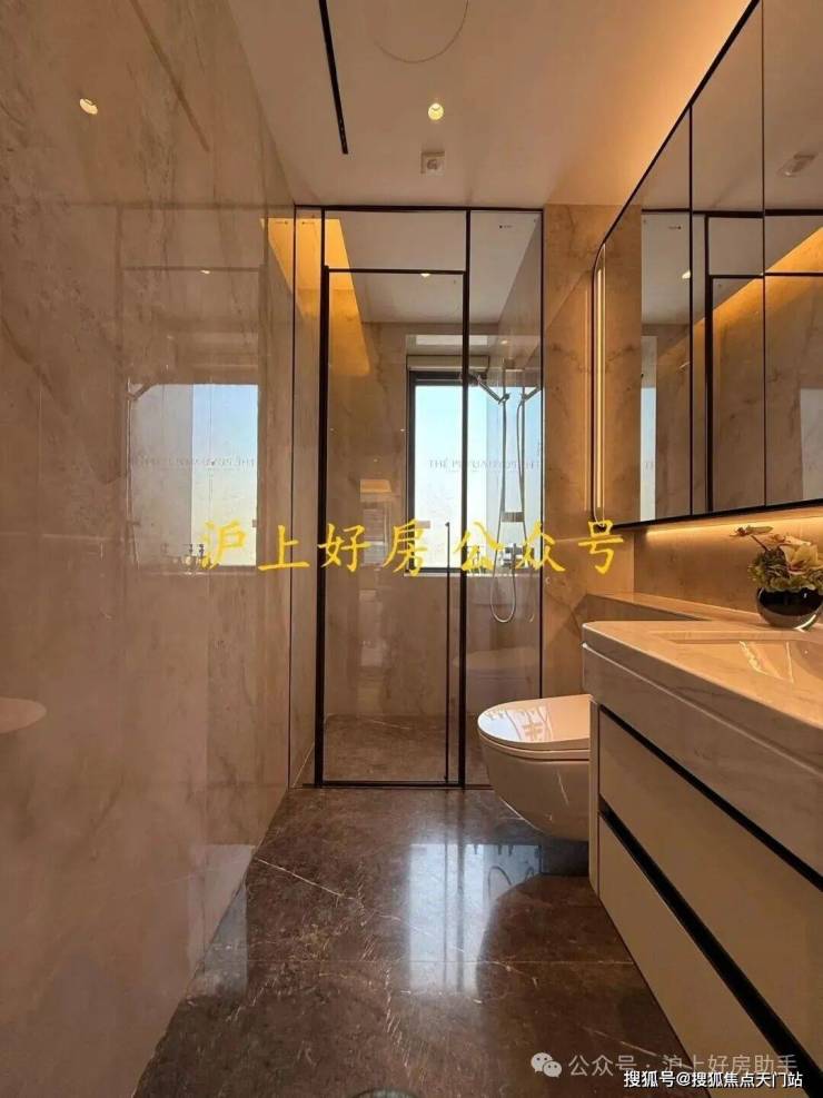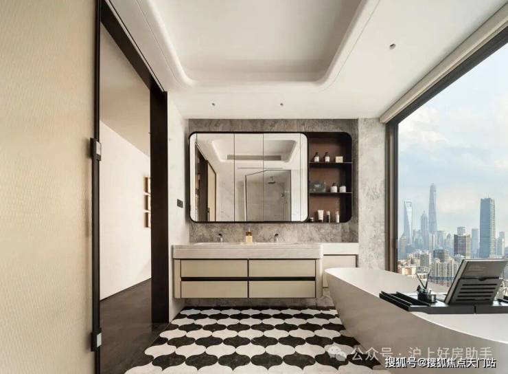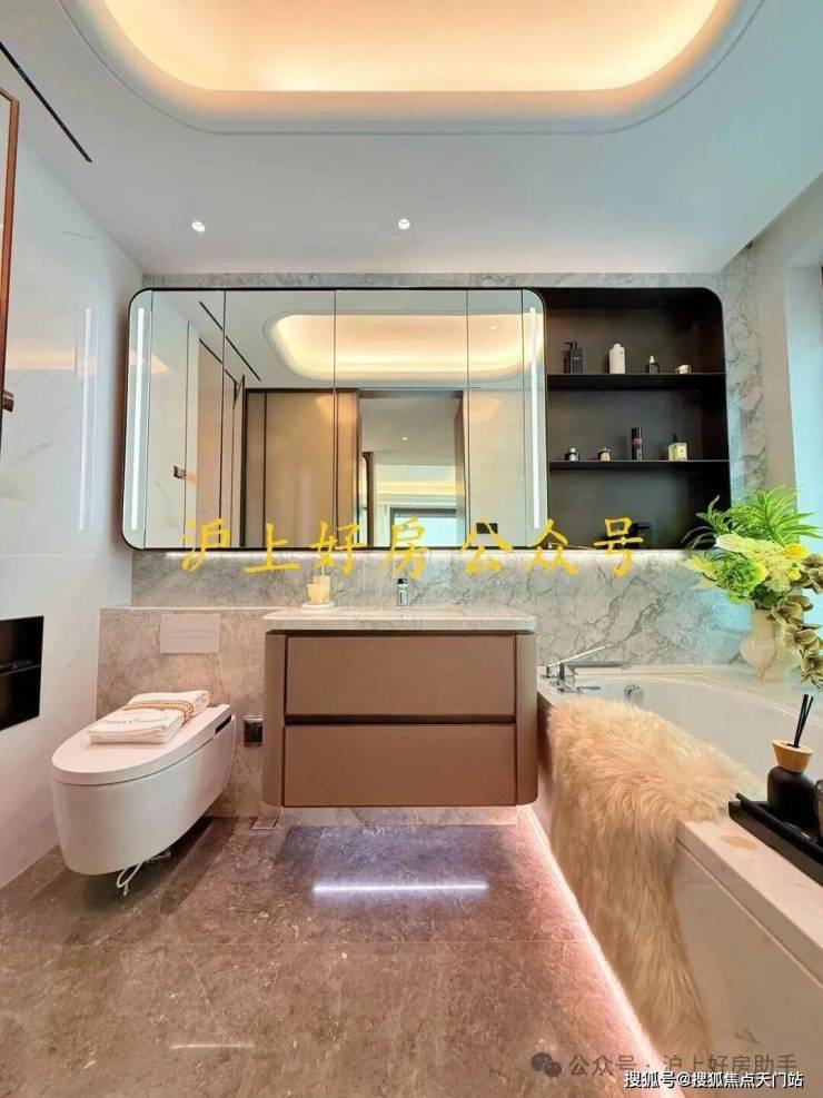另外,卫生间也是配置拉满,劳芬的马桶、当代的龙头、内置美妆冰箱的镜柜、大理石的地面、江南烟雨奢石的墙面一应俱全!