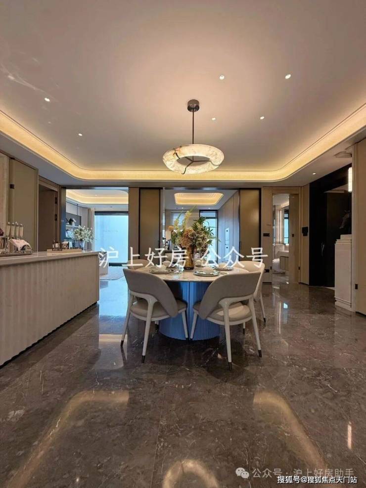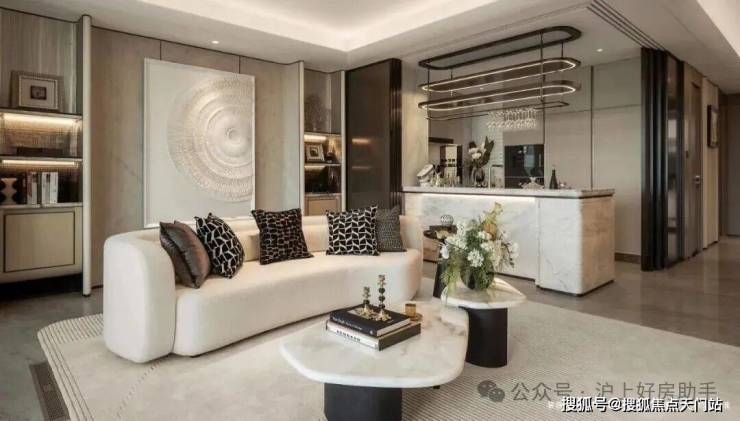 室内大量运用奢石,搭配统一木饰面与皮革材质,通过圆弧设计、隐形出风口、无高差客厨地面等“隐形美学”处理,让奢华与舒适完美融合。