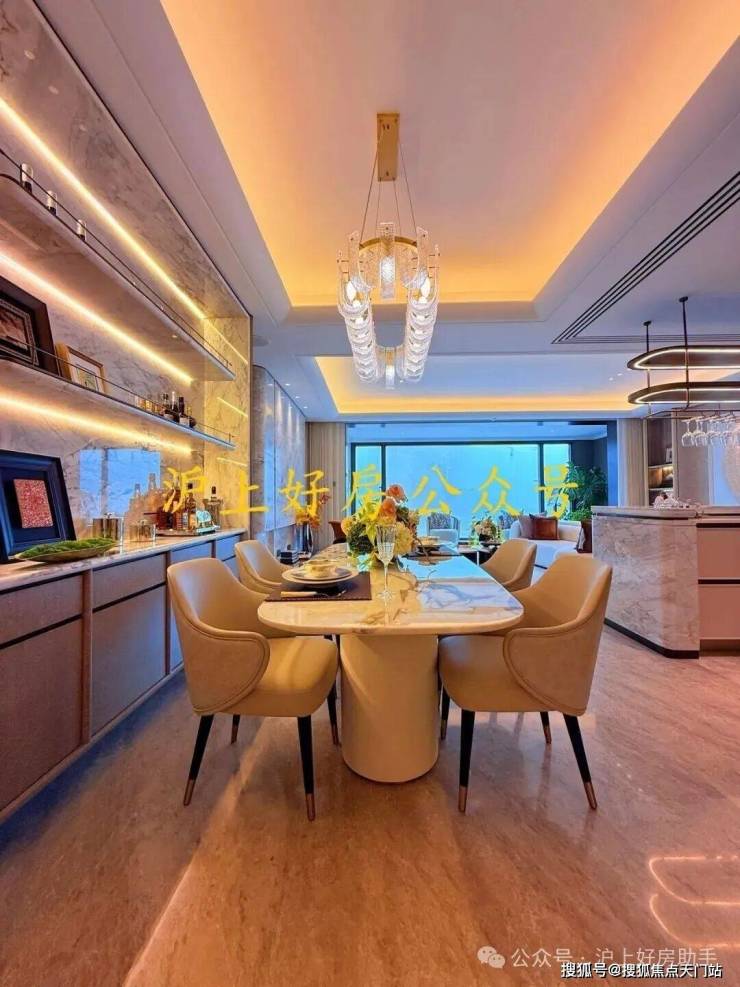 餐厅区域打造了整面墙的餐边柜(交付标准),中间是弧形的芬迪白奢石背景墙,工艺复杂,视觉效果非常震撼