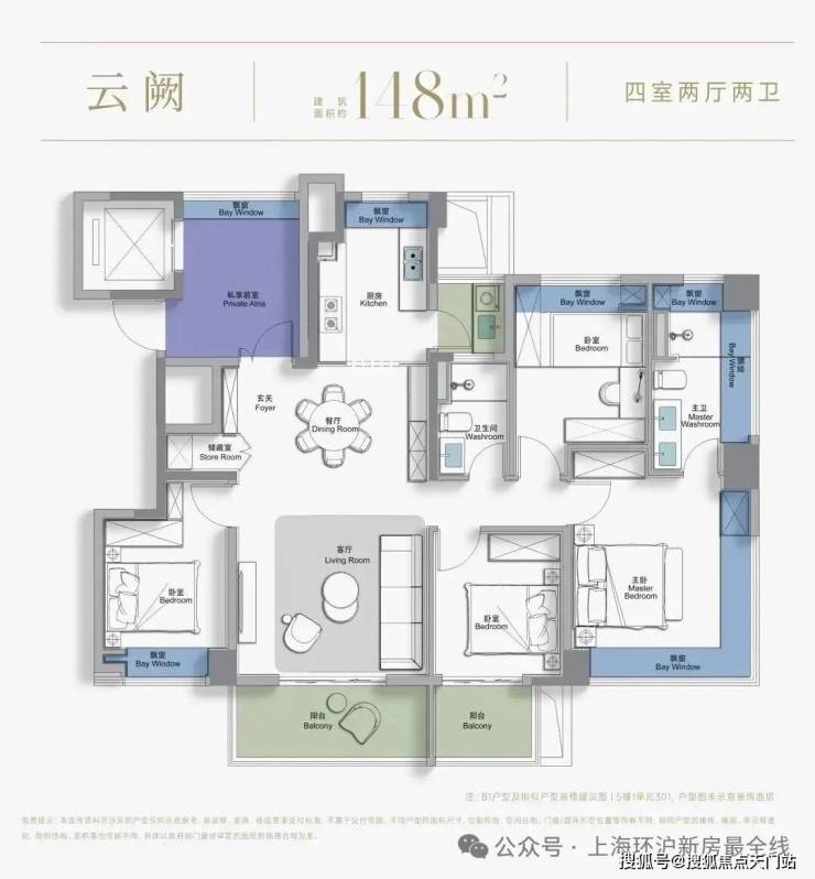 尺度感上: 这是新政后松江板块首个 四开间朝南、且不封阳台的三阳台 户型。