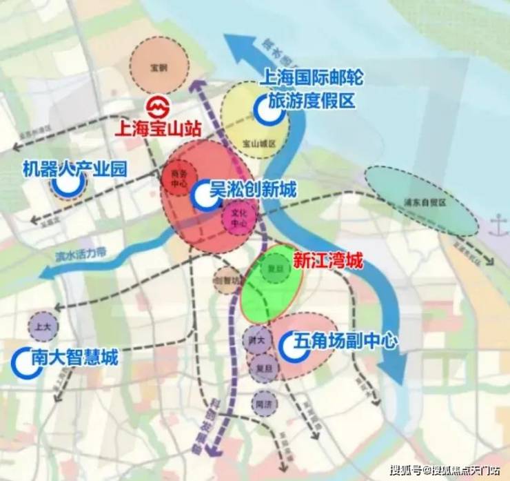 新江湾城的北翼,上海9大主城副中心之一的 吴淞创新城 , 正在经历“北转型”科创产业大升级。新江湾城的南翼,另一个主城副中心 江湾五角场 ,作为“金色中环发展带”,串起上海北部核心商务区,正从传统都市商圈向产学研复合城区变迁。