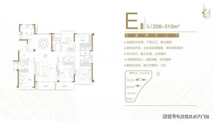 建面约208-210㎡五室两厅三卫户型特点:全明采光布局,户型方正,南北通透;南向四开间,主生活区域朝南,阳光清风常伴;双卫设计,客卫分离,从容美好;U型厨房设计,动线流畅,空间阔绰;套房式主卧,独立衣帽间、卫浴。