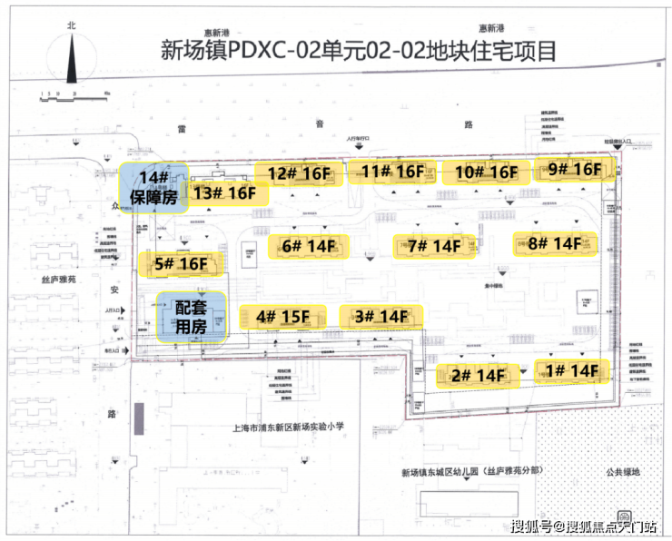 根据项目规划设计方案显示, 拟建6栋14F商品房、1栋15F商品房、6栋16F商品房、1栋16F保障房、1栋2F社区配套、1个KT站、5个PT站地上建筑、1个垃圾房、1座地下车库。