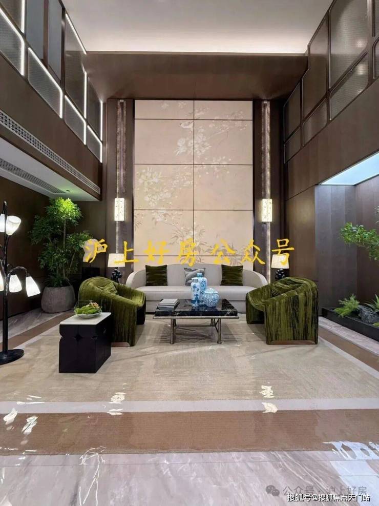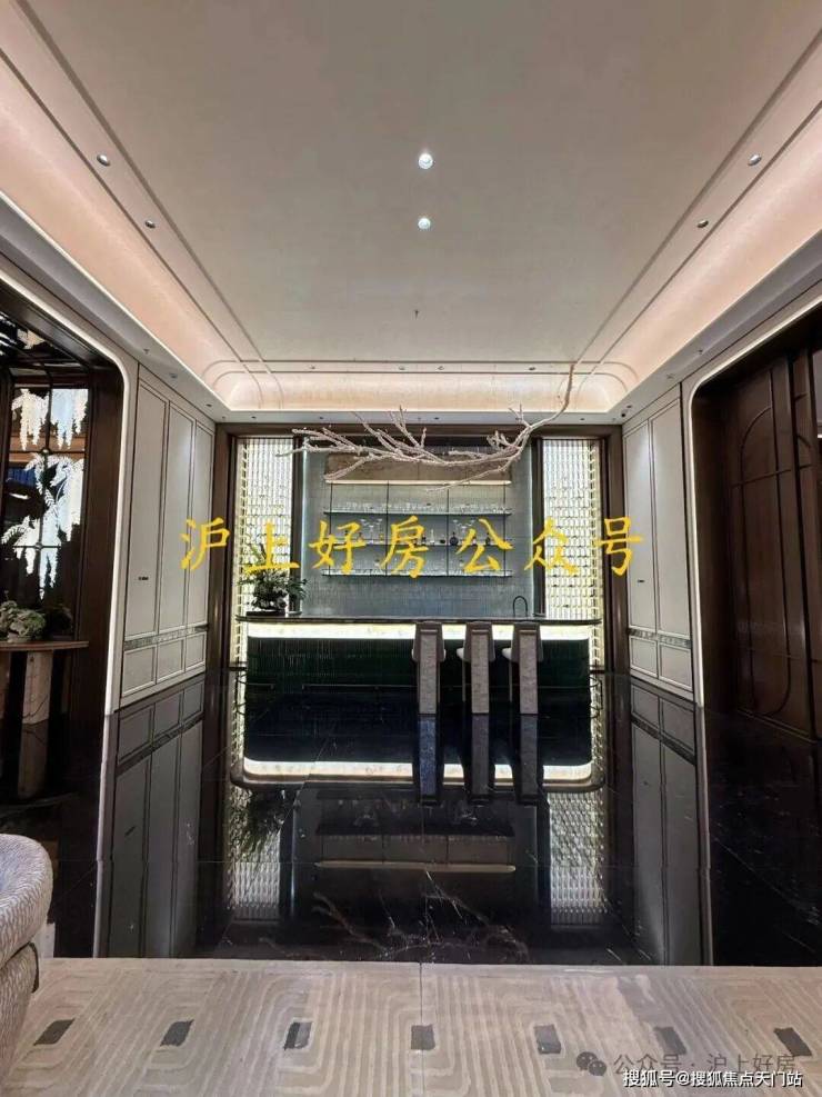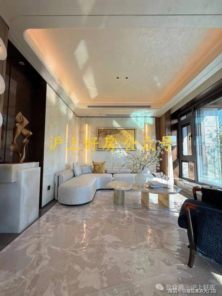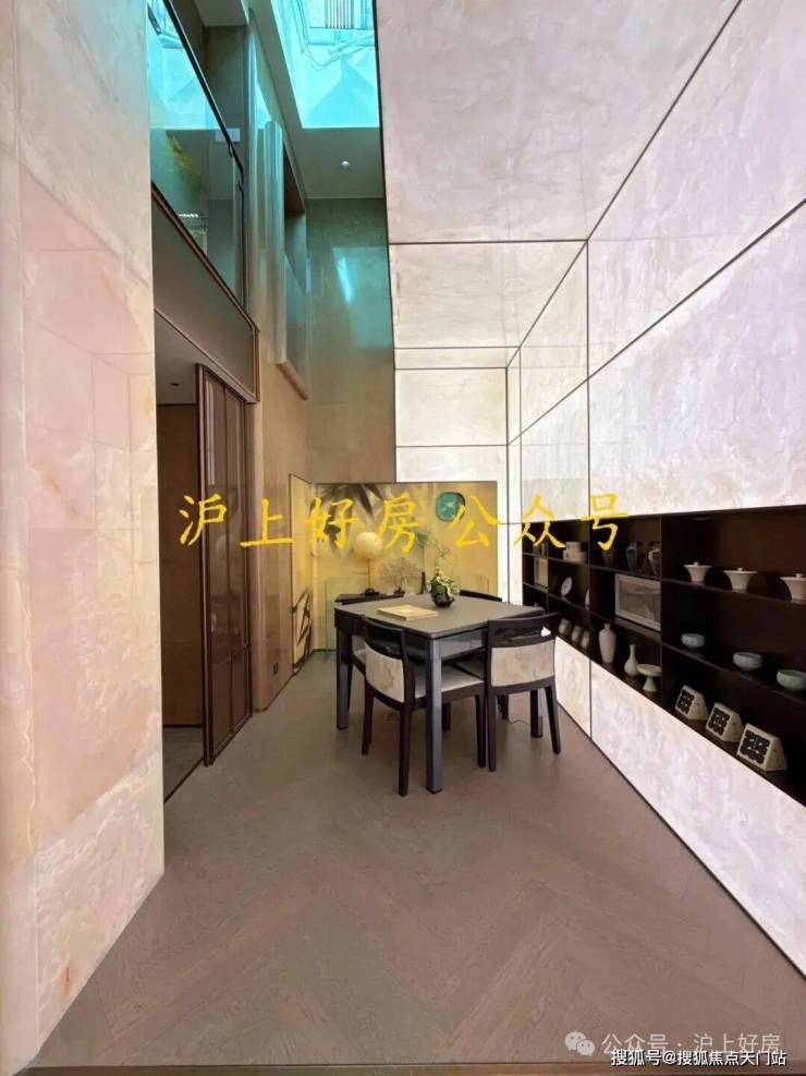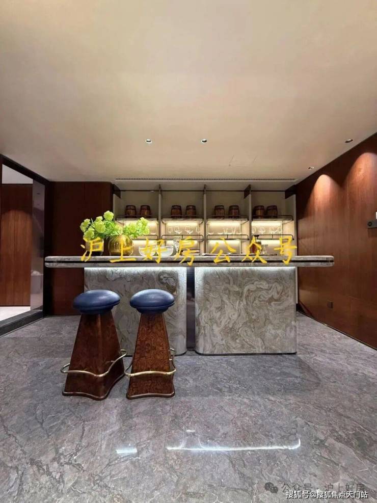 首先是奢石含量极高,从入户处的玲珑玉拼花与透光云石辉映,到翡翠绿奢石墙景、再到发光云石装饰点亮归家路,石材的典雅贯穿始终。