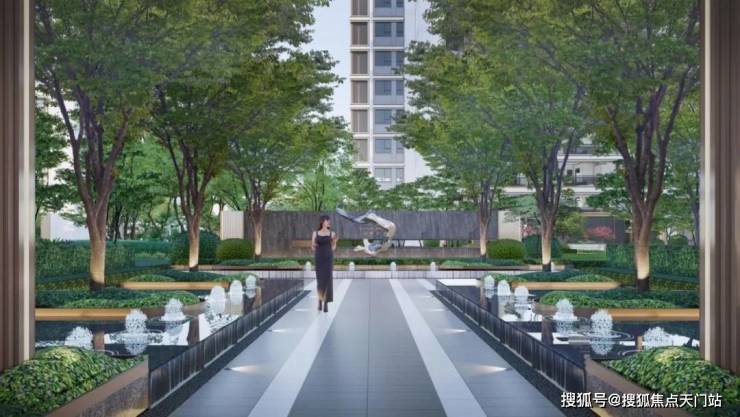 项目北入口门楼设置中庭照壁,内部为礼仪轴线,两侧阵列式景观和对称水景,以品质感雕塑结合景墙,打造沉浸式步入体验,营造礼仪归家。