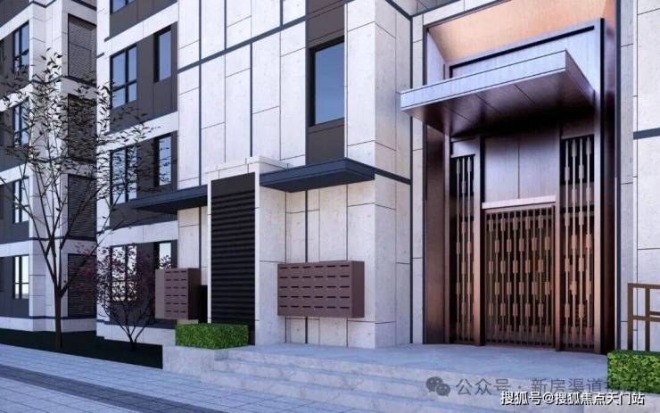 单元门头引入现代审美观念,整体两层通高,以绚丽的金属铝板搭配精致的装饰纹理格栅打造,呈现出高级的品质感,营造出充满仪式感的归家氛围。并且引入业主人脸识别、多种复合刷卡、呼叫方式出入,访客可通过门口机呼叫业主室内机授权入楼,主客进出更方便、更安全。