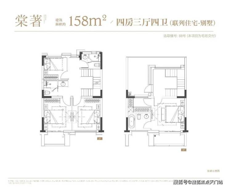 下叠户型4房2厅3卫,一层会客区,二层居住区,附带地下空间,可以根据主人喜好,定制成如健身房、酒窖、影音室、台球房等,任凭想象。