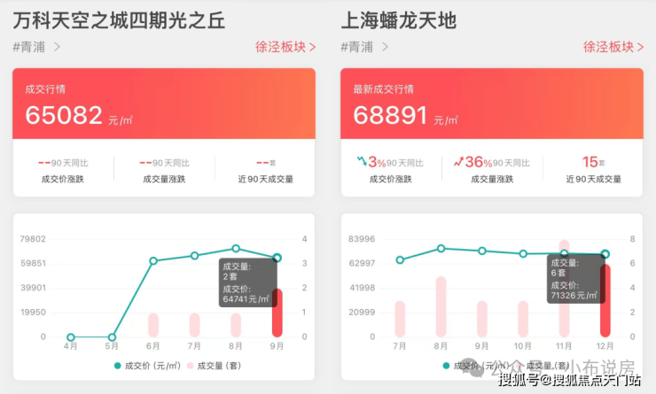 据兔博士数据显示,上海蟠龙天地最新成交均价约6.88万/㎡;万科天空之城最新成交均价约6.5万/㎡。