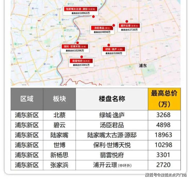 浦东的保利世博天悦最高总价过亿,陆家嘴太古源 源邸最高总价近1.9亿;北蔡、新杨思低密产品目前总价天花板都在3300万左右。张家浜浦开云璟最高总价超过了浦开摩登江南。