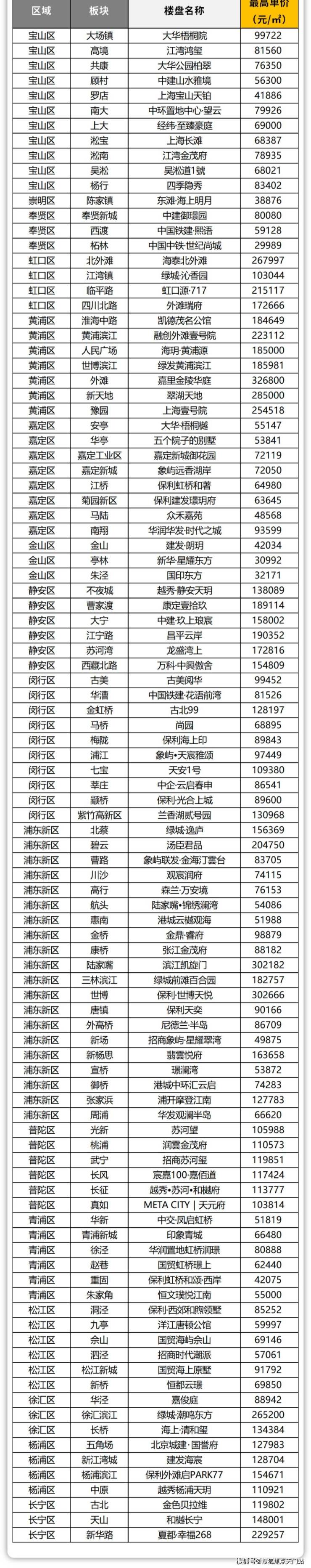 基于此,我们不妨梳理2024年以来上海新房各板块的最高单价与总价,若这些高价房源成功售出,便可将其视为对应板块购买力与接受度的天花板水平。