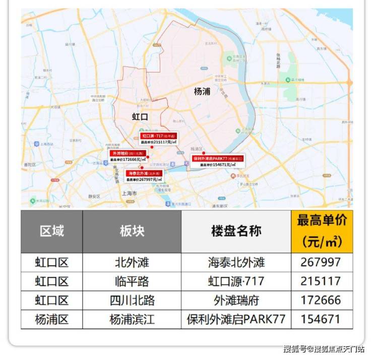 虹口最高价依旧是海泰北外滩,达约26.8万/㎡;绿城地王或许在不久将来能改写;