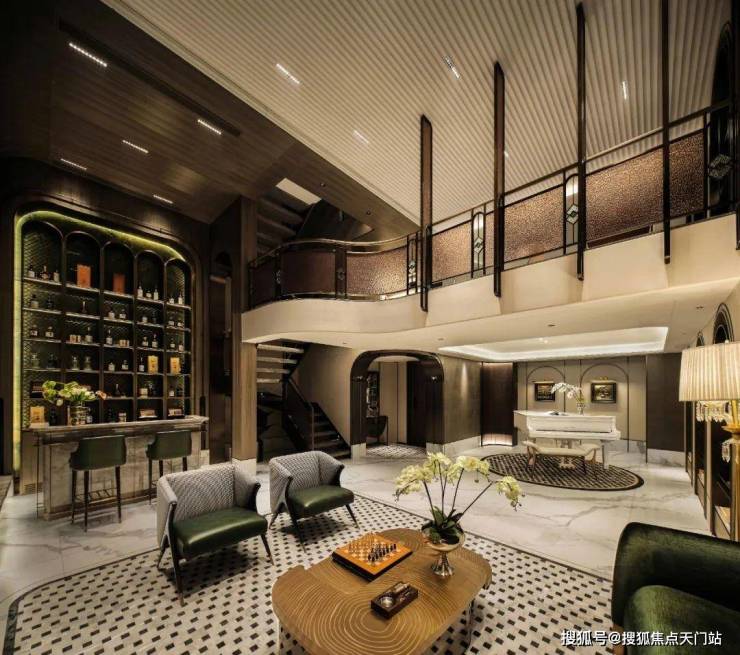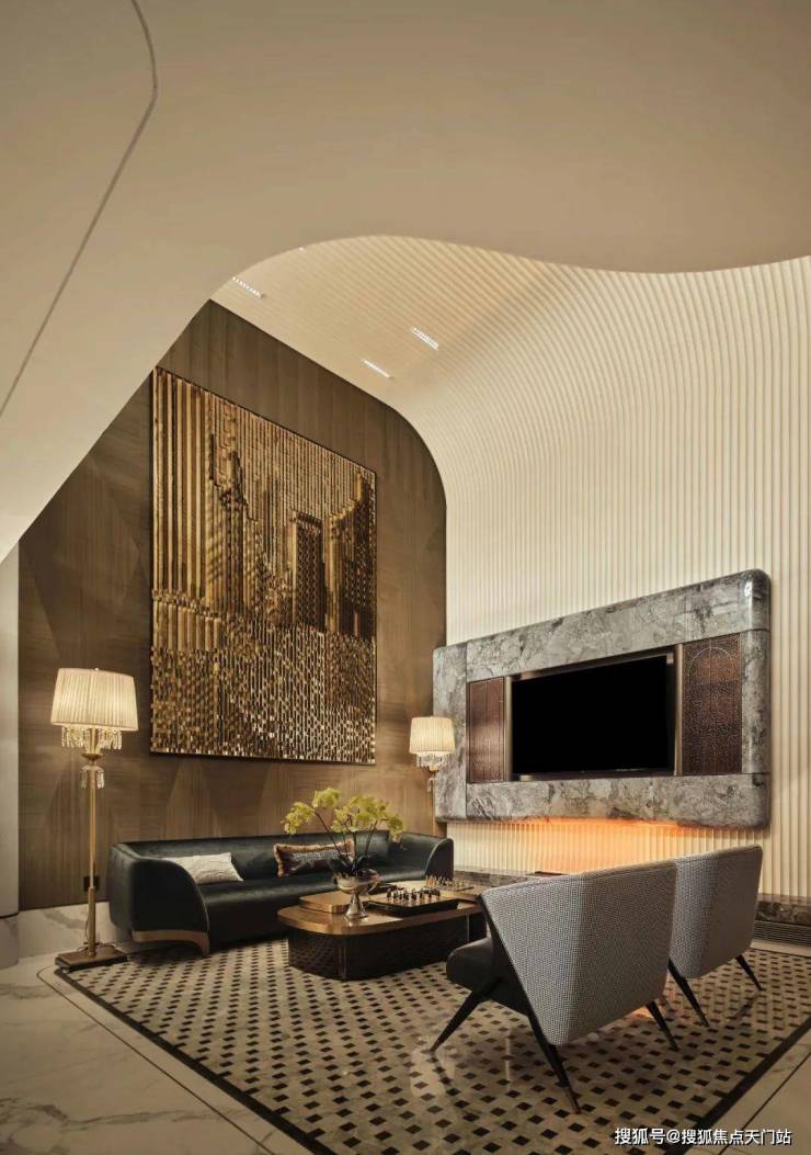 地下层是整个空间气场的焦距点,挺阔的构架式设计,顶面有序的木质分割中,波纹造型将天花与立面持续延伸,有效的拓展了空间高度。