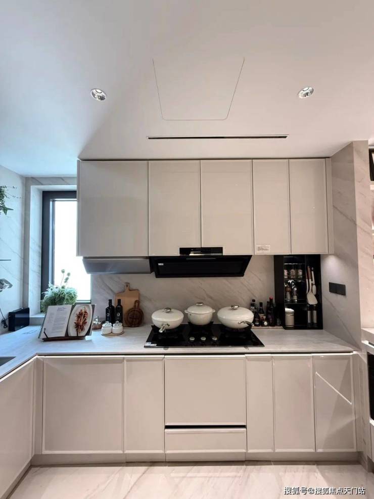 收纳细节上,二期户型中完美继承了一期的收纳系统,玄关收纳,整面内嵌柜体一直延伸到餐边柜;厨房全屋定制的柜体;卫浴的镜面柜和美妆冰箱等等,主卧卫生间的进一步升级:洗手台与化妆台相对,拥有三面镜柜,视觉空间进一步扩展和延伸。