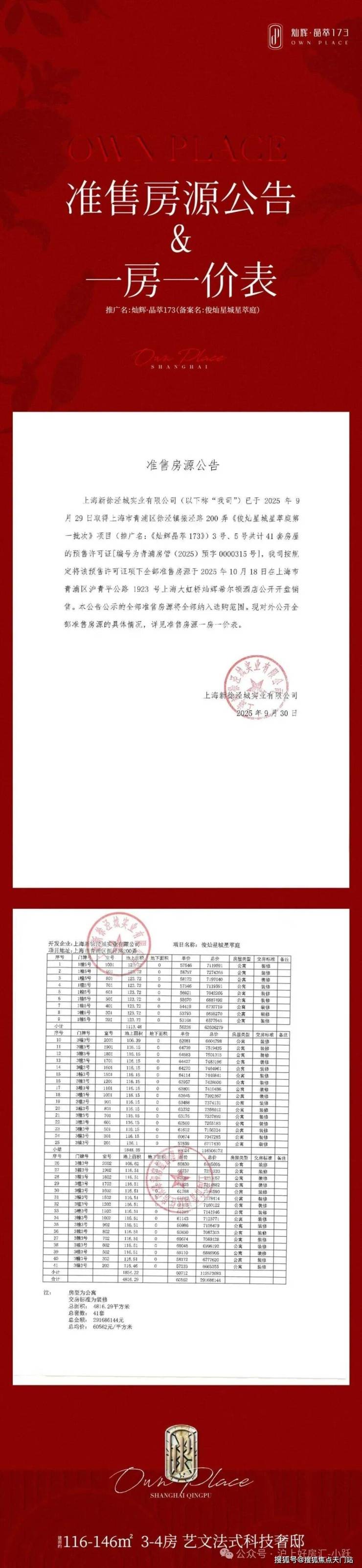 最新消息,一房一价表发布!大虹桥徐泾「灿辉晶萃173」10.7开始认购!推出建面约106-124㎡三房,均价6.05万/㎡!