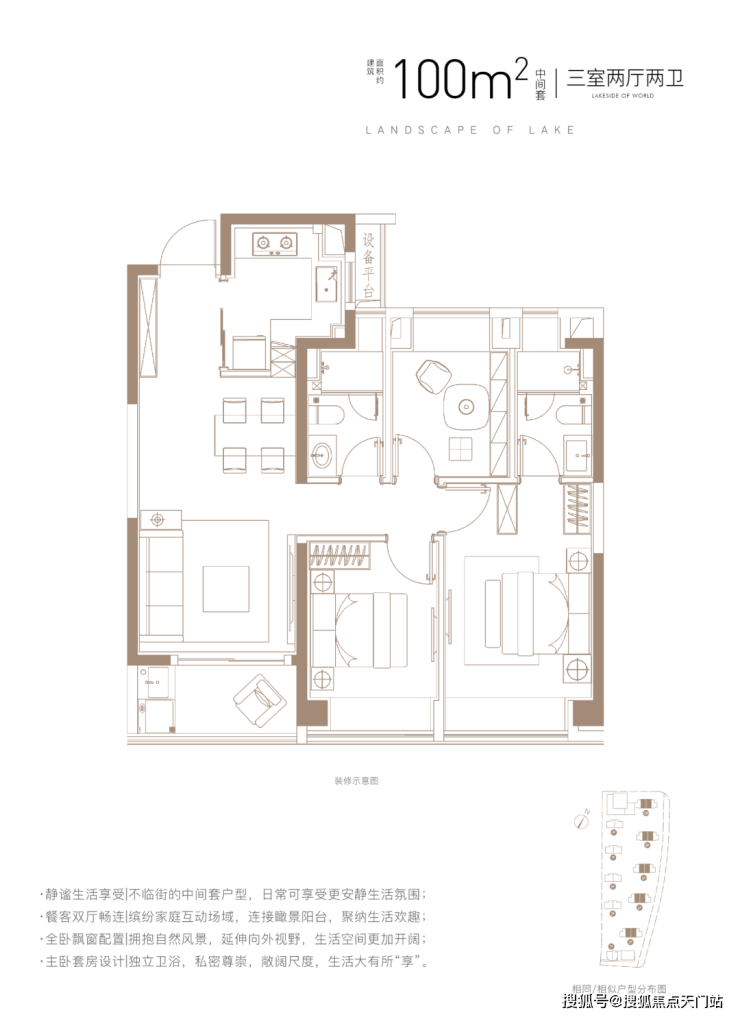建面约100㎡3房2厅2卫,做到了 三开间朝南+主卧套房设计+动静分离+全卧室带飘窗,功能性和尺度感完美结合的3房户型。