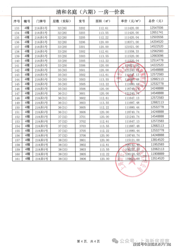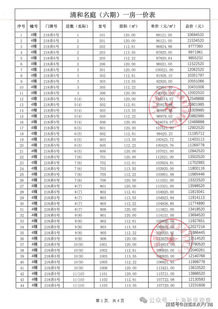 一房一价表如下