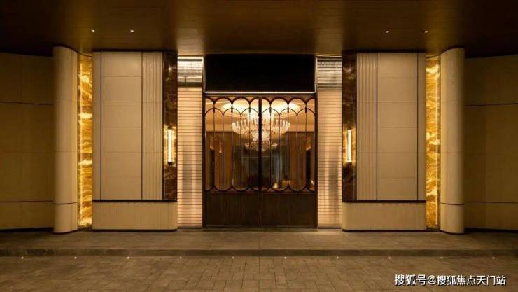 6、 社区含“奢材”量很高。 门庭延街的外立面,以精工定制弧形 米色石材 为主调,镶嵌典藏级 老虎玉大理石 ,点缀 古铜色现代海派艺术感 灯器,整体呈现出百年海派的贵雅气质。