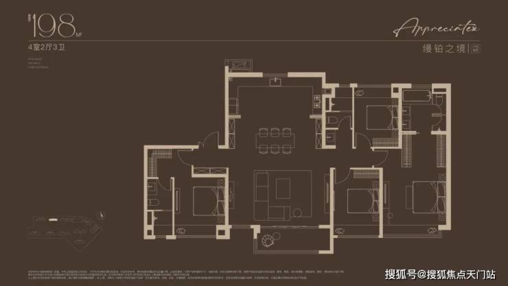 建面约198㎡4房户型,嘉定“收藏级”传世大宅!塔尖人士的挚爱之选!2梯2户的设计,子母双开门礼序入户,私密尊崇门厅,彰显尊崇生活仪式感。