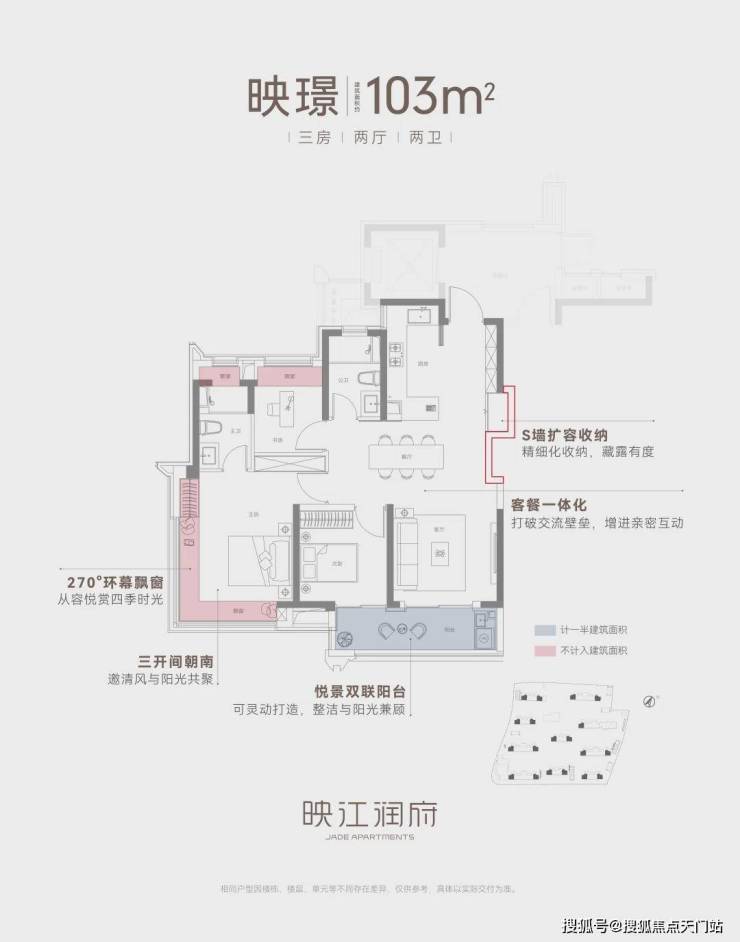 建筑面积约103㎡三房两厅两卫,不失为改善家庭的首选。其中边套户型,映江润府的主卧套房做了 270°环幕飘窗,实现无与伦比的采光通风和视野享受,类比于千万级豪宅的体验!
