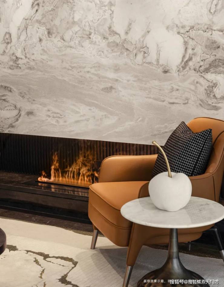 客厅背景墙的“烟雨江南”天然大理石,不同于传统平面背景墙,通过弧度及立体的造型处理,并镶嵌不锈钢材质,对于金茂而言,比奢石昂贵的,是让奢石真正与空间气场融为一体。