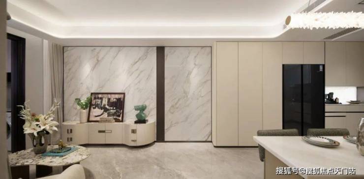 值得一提的是,入户玄关设置 一整面的玄关柜空间左侧分户墙处增设“凹型空间" , 预留内嵌 双开门 冰箱空间 。