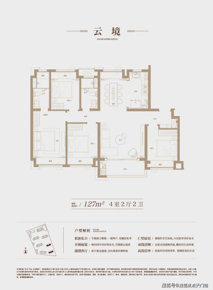 建面约127㎡的「云境」空间内, 四开间南向结合舒朗的方厅,大尺度的面宽让光赋予了生活更多的灵感。 厨房U形台面,尽情挥洒味觉灵感, 一体化的客餐厅创造更丰富的用餐、社交场景,从西式brunch到日式omakase,尽享味蕾的欢愉时光。 一梯两户的入户,搭配轩朗的玄关,让每一次归家,都更从容......