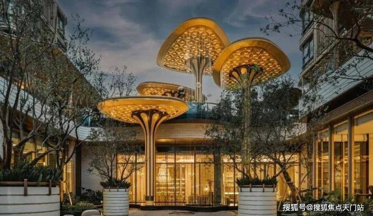 以雅艺柔美的对称主义构筑社区入口大门,从森林中获取灵感,宏观提取叶脉形态,呈现犹如自然中的脉络与流动;同时深入微观的细胞视角,复刻植物的几何纹理与结构逻辑,以自然的秩序与美学塑造“花瓣状的母题造型”。