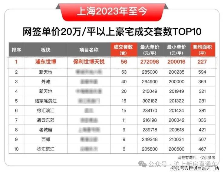 再将时间轴往前移,从2023年至今上海豪宅单价超20万/m²的成交量排行中,保利世博天悦甚至力压新天地、外滩、陆家嘴、苏河湾、徐汇滨江等一众热门板块新盘,问鼎上海豪宅之巅!
