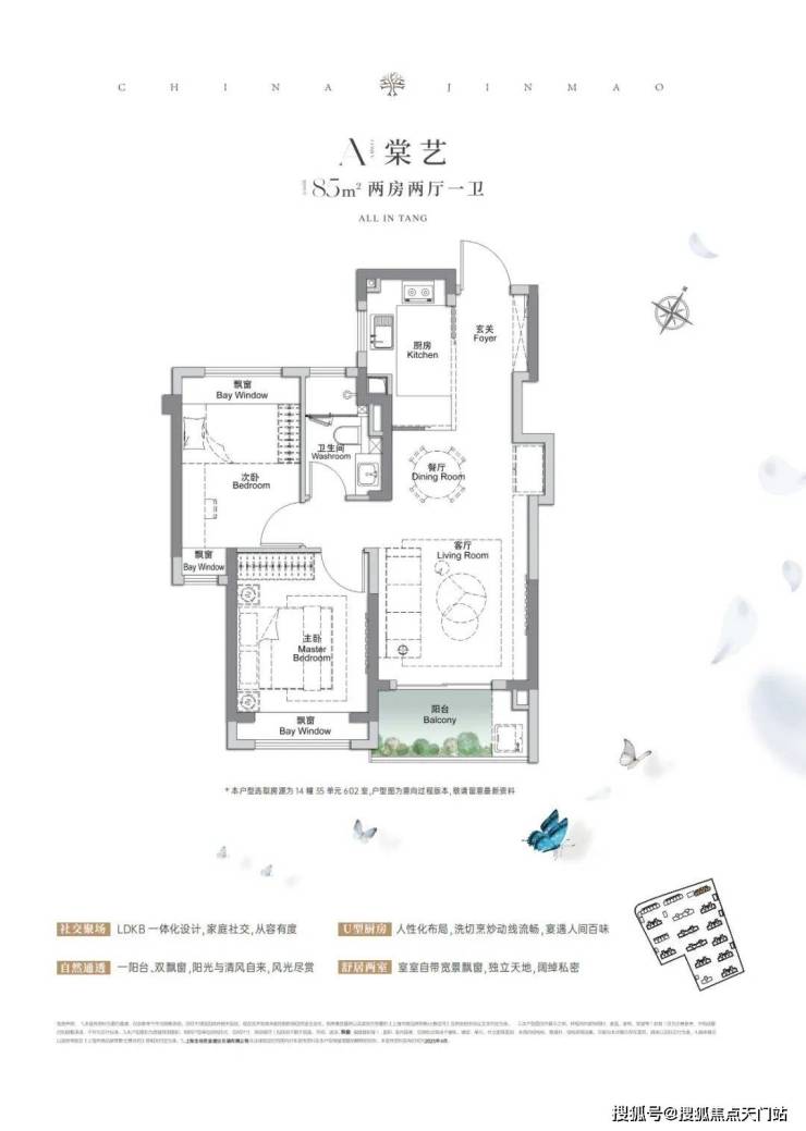 建面约85㎡两房:竖厅设计+独立玄关+双开间朝南,次卧飘窗拓展空间,适配年轻夫妻首置;