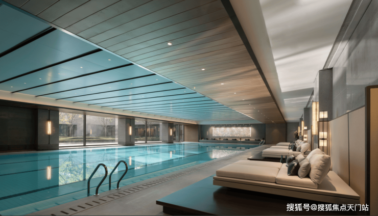 首先,以下沉式布局拓展双层立体空间,让内部得以容纳 私宴厅、半标恒温泳池(配4条泳道)、健身房、会客厅 等多功能场景,并结合叠水、树阵、庭院等园林景观,实现内外空间的交互,拉近人与自然的距离。