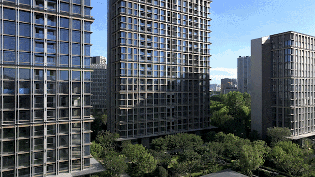 世博天悦采用类公建化立面,通过大面积玻璃设计和开放式铝板密拼工艺,一同拼接出美轮美奂的建筑轮廓,同频全球顶豪作品。