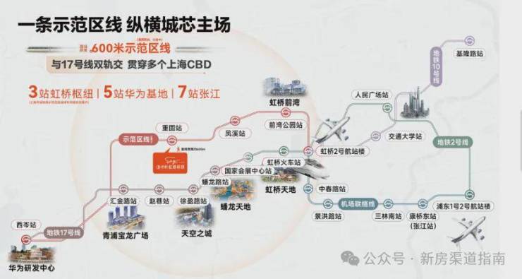 示范区沿线汇聚大量高能商业。2到到前湾芳乐路TOD,有开市客及前湾印象城(在建),3站到虹桥枢纽,则有虹桥天地及龙湖天街等。另外徐盈路天空之城、徐泾蟠龙天地、百老汇等也能快速抵达。