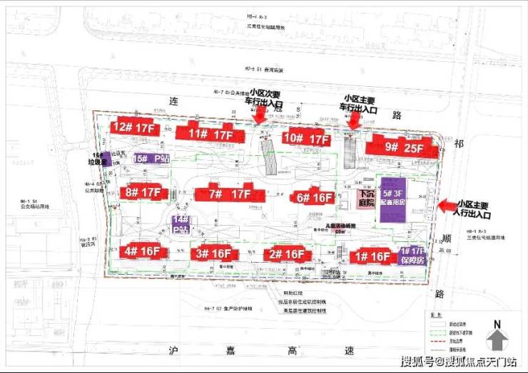 其中1号楼靠近17层的保障房,5号口为3层的配套用房;14#、15#为P站,16#为垃圾用房。