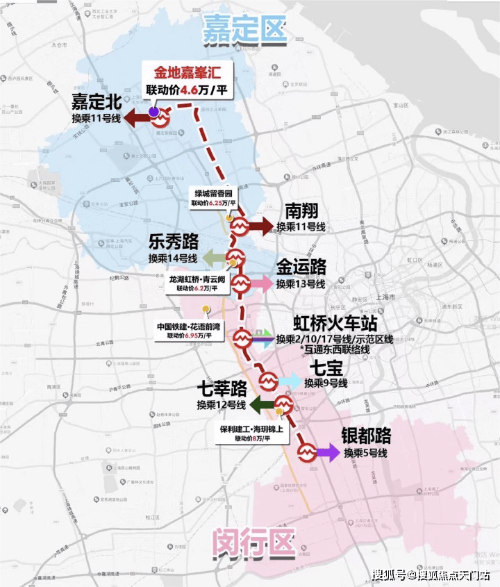 直线距离约200米嘉闵线(在建),8站直达大虹桥,连接七宝、莘庄等多个CBD,不论是上下班、聚会、商务出差等都十分便捷。另外值得一提的是沿线新盘均价均在6-8万区间,其中约350万总价的潜力盘或许只有金地嘉峯汇!