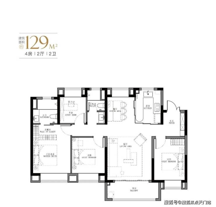 产品:103㎡、107㎡的三房两厅两卫及123㎡、129㎡的四房两厅两卫