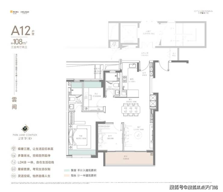而建面约108㎡的明星户型,则在有限的空间内做到了尺度感与舒适度的最大化。 横跨客厅与次卧的巨型宽面阳台,采光面极为奢侈