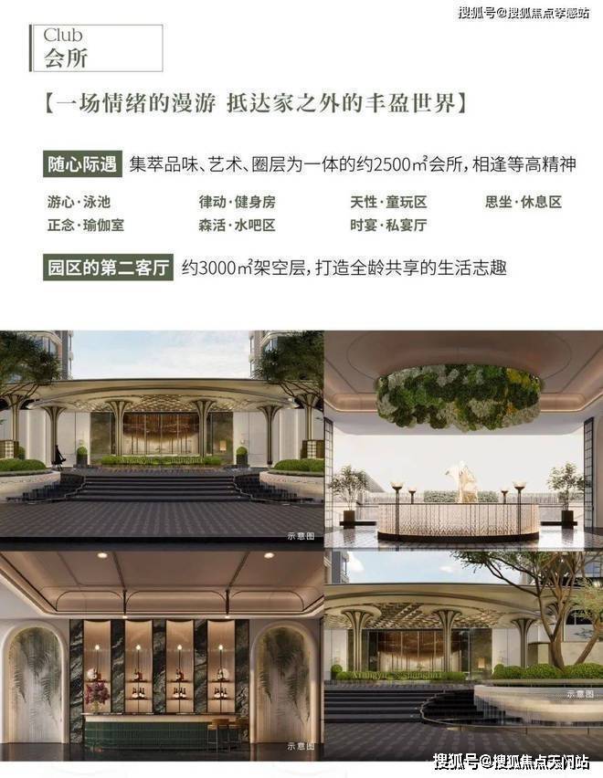 社区上配备了约2500㎡会所, 设置了游⼼·泳池、天性·童玩区、思坐·休息区、律动·健身房、正念·瑜伽室、森活·⽔吧区、时宴·私宴厅等,还有约3000㎡架空层。