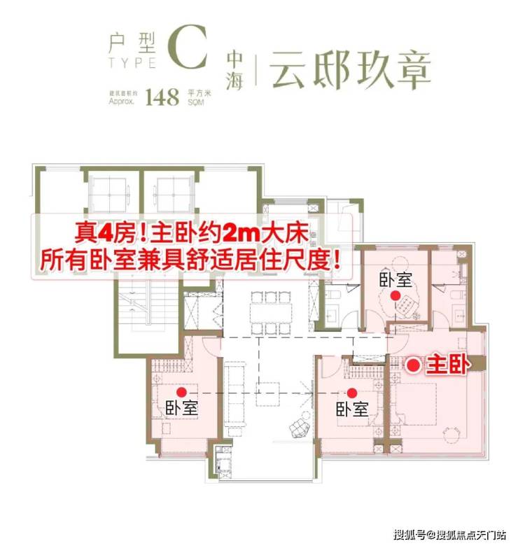 综上所述,中海·云邸玖章的户型在成功前作的基础上又做了大量创新,走在了时代的前列,尤其是建面约148㎡户型在实现真四房的同时,尺度感也能媲美160㎡以上同类竞品,性价比与舒适度兼具,值得关注!