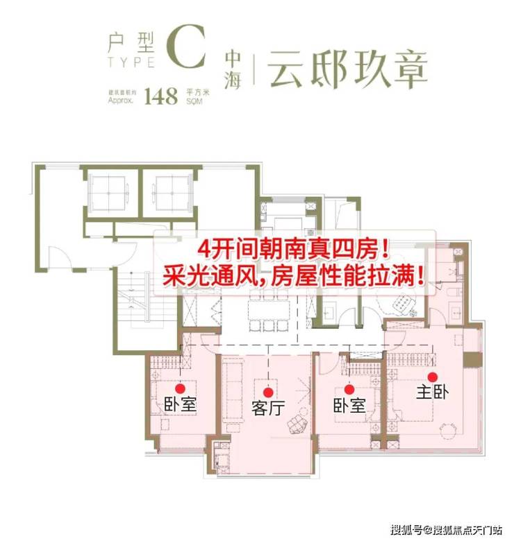 阔绰的南向面宽向来是中海户型的卖点,没想到在建面约148㎡户型上直接做到了四开间朝南,奢侈的南向开间让业主起居之间沐浴充足阳光!