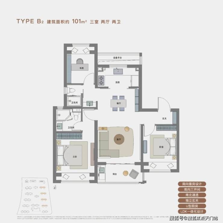 B2户型则是含金量非常高的 南北通透飞机户型 ,动线更加合理。